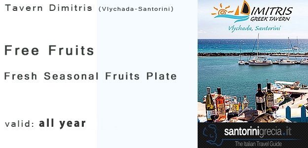 (i) Limit one coupon per customer. (ii) Cannot be combined with any other discount or promotion. (iii) Coupon must be presented and surrendered at the time of transaction. (iv) Only valid with a meal purchase at Tavern Dimitris located at Vlychada - 84703 Santorini (Greece) and may not be valid at other store locations or online. (v) Coupon has no cash value and is void if transferred, purchasedor sold. (vi) Void where prohibited.