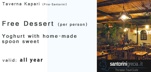 (i) Limit one coupon per customer. (ii) Cannot be combined with any other discount or promotion. (iii) Coupon must be presented and surrendered at the time of transaction. (iv) Only valid with a meal purchase at Taverna Kapari located at Fira - 84700 Santorini (Greece) and may not be valid at other store locations or online. (v) Coupon has no cash value and is void if transferred, purchasedor sold. (vi) Void where prohibited.