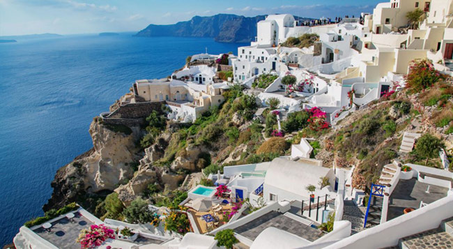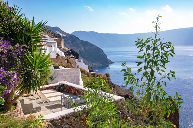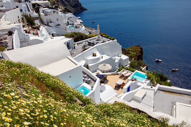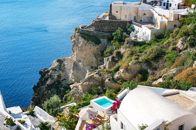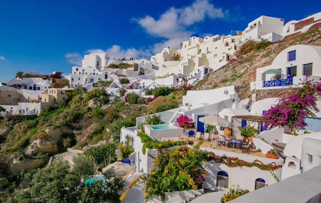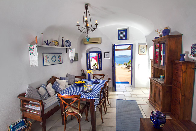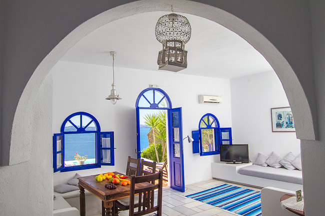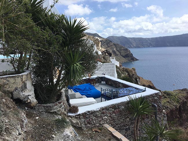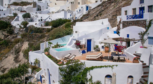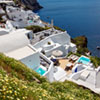 Our Villas can be reached with a short walk from Nomikou str, the main marble street of Oia. Once you reach the Ambrosia Restaurant (a terrace on the Caldera) take the stairs on the left hand side of the restaurant and go down following the stairs which are like paths to fly away from the noise of the crowd and to lay on the reflections of its silence.