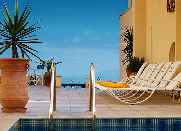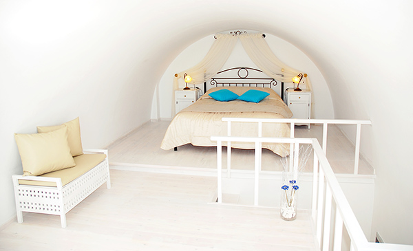 Suite: The Suites are situated on the highest floor (third) of the hotel and have a private balcony overlooking the Caldera. The Suites consist of 2 levels, separate bedroom (upstairs) and living area (downstairs). There are extra features in this room-type, such as a Jacuzzi bathtub in the bathroom, fully equipped kitchen, bathrobes and slippers.