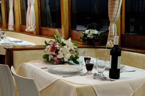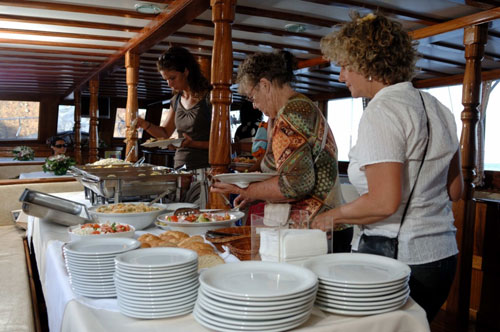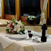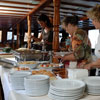 Menu for dinner on board can include: pork rolls, chiken rolls, rice, baked potatoes, greek salad, tzatziki, variety of cheeses, bread, water, wine and fruits.