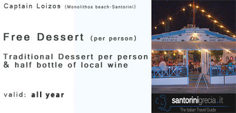 Captain Loizos is a traditional fish tavern run by a fishermen family of Santorini and located 5 meters from the sandy beach of Monolithos, organized with umbrellas, sun beds and a playground for children.