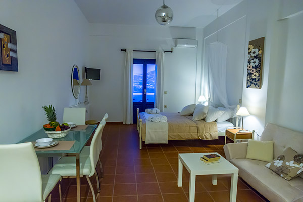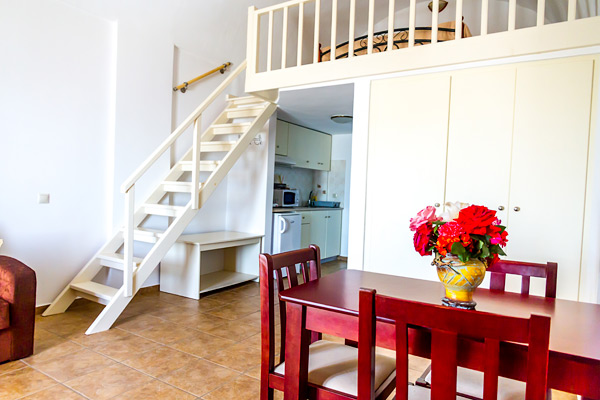 Each apartment is a 2-storey "open loft" boasting, on the lower floor, a private balcony with sea/pool view, a spacious living/dining area with a fully equipped kitchenette, refrigerator and microwave, and a private bathroom with shower.