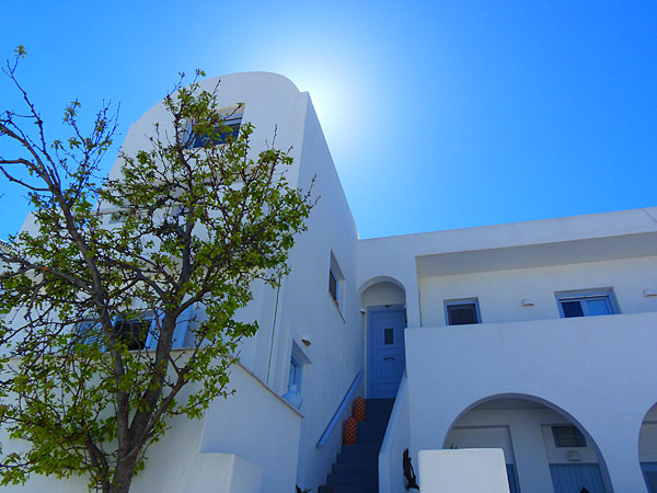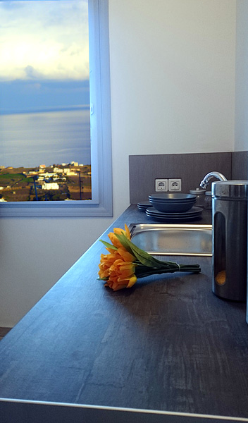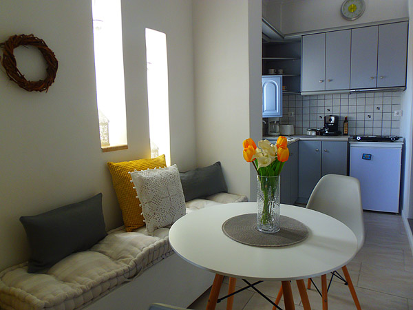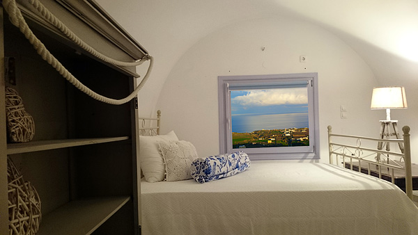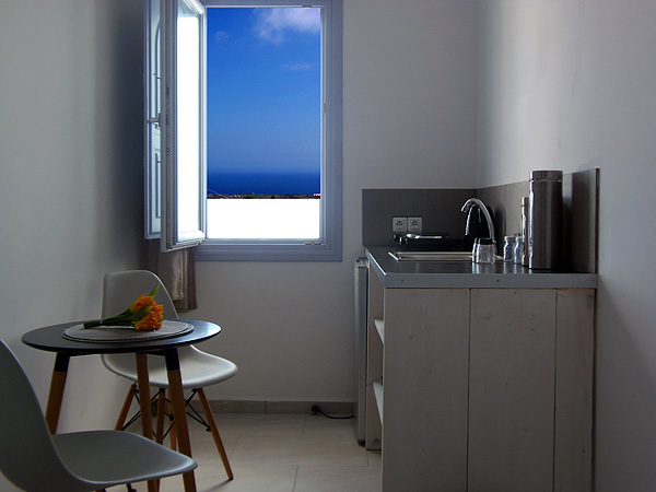 Junior Villa for 2-4 persons: cozy villa suitable for 2-4 people, consisting of a separate bedroom with double bed, light fresh decoration and an open plan living room with kitchenette and two single beds, private balcony with sunrise & sea view over the eastern coast of Santorini. A shared free parking is also available.