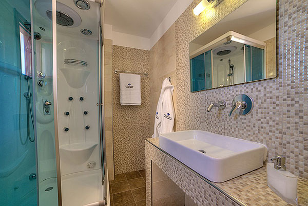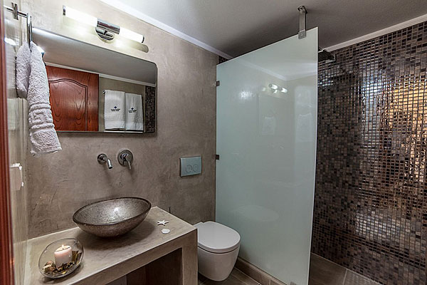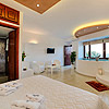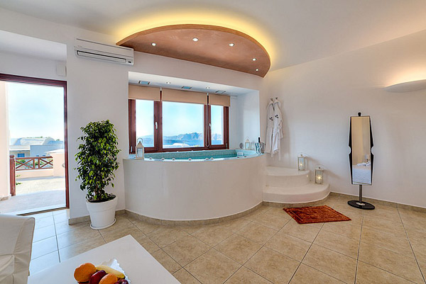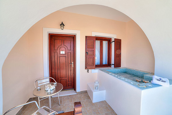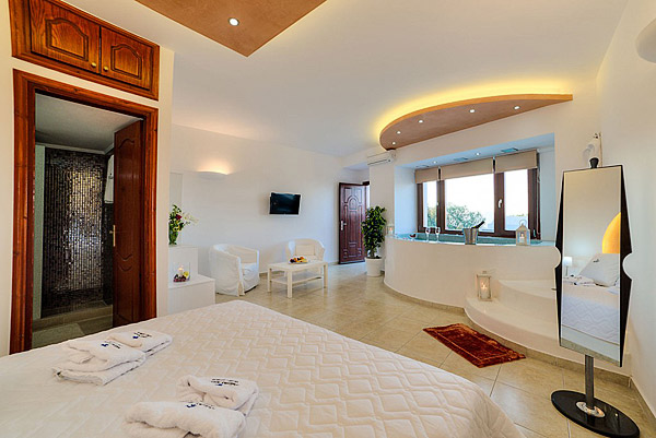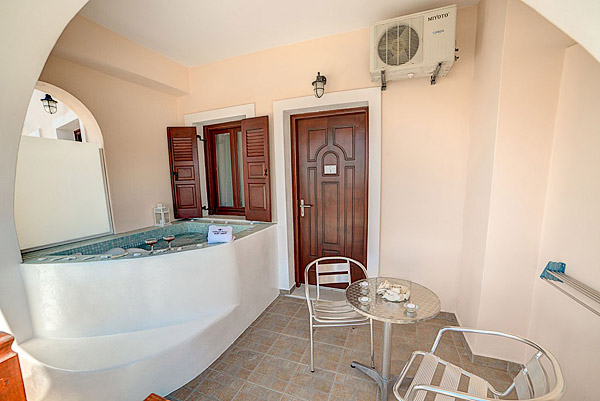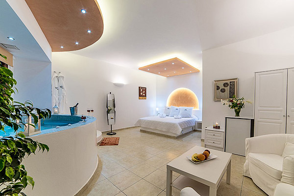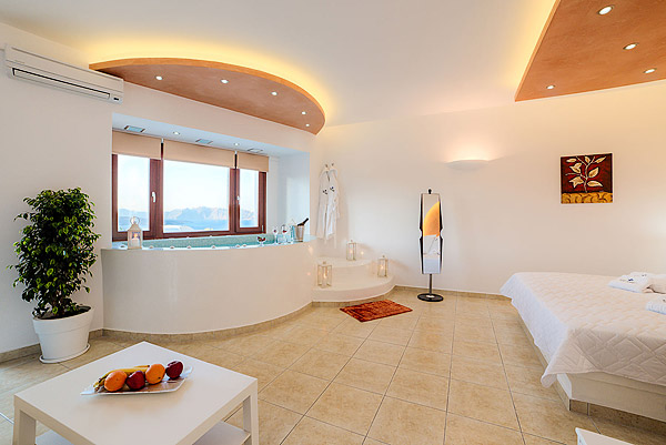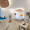 The Junior Suite is located on the ground floor of the property and has 1 king size bed, living room with sofa bed, bathroom with shower and a private terrace with outdoor hot tub and sun beds overlooking the caldera. The room is about 40 sq.m. and can accommodate a maximum of persons 3. The Junior Suite also has air conditioning, TV 32 '' LCD / Plasma, free Wi-Fi, refrigerator, safe, hair dryer, in-room breakfast on request (extra fee), Jacuzzi, soundproofing, utility room, electric kettle, espresso machine. |