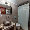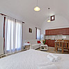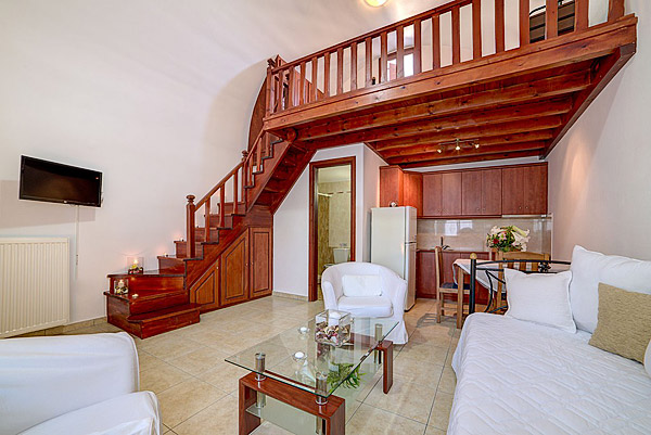 The triple apartment is equipped with a fully equipped kitchen with a wooden loft, which serves the needs of three people or a three member family. It features a private balcony overlooking the volcano and the amazing Santorini Caldera.